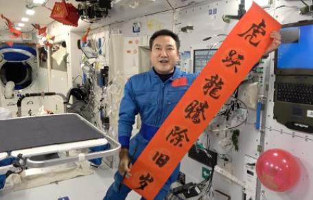 2022年1月31日正值除夕,神舟十三号航天员在遥远的太空专门发来视频,向祖国和人民送上祝福。这是指令长翟志刚拿着春联送上祝福(视频截图)。新华社发