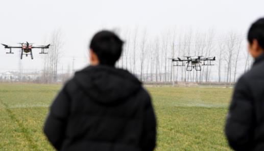 2月11日,无人机在安徽省亳州市赵桥乡“无人农场”喷洒除草剂。新华社记者 刘军喜 摄