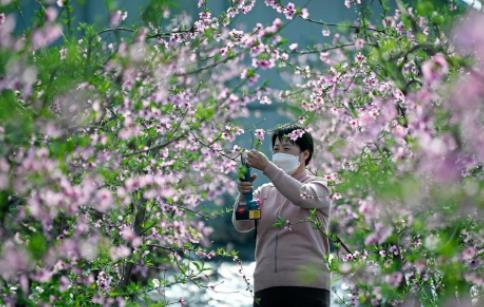 2月15日,宁夏青铜峡市大坝镇韦桥村村民李文会在日光温室为桃树疏果、剪枝。新华社记者 王鹏 摄
