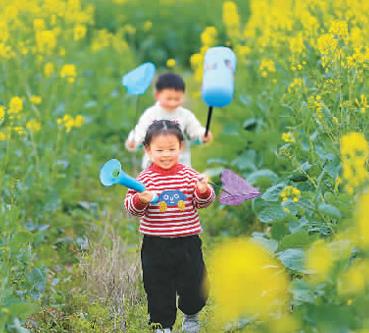 2月26日,湖南省永州市道县祥霖铺镇两河口村,小朋友在油菜花田里玩耍。何红福摄(人民视觉)