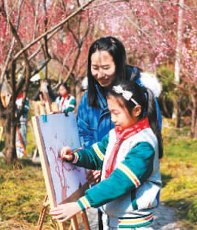 2月23日,江苏省宿迁市泗洪县洪桥学校开展“好作业——描绘春天”课外实践活动,学生在老师的指导下画梅花。刘成龙摄(人民视觉)