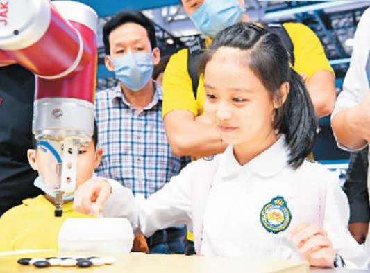 10月13日,福建省福州市鼓楼区第二中心小学五年级学生范语涵在第三届数字中国建设成果展览会现场与机器人下棋。陈彬 摄(人民视觉)
