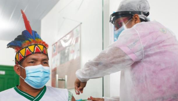 医护人员在巴西亚马孙州塔巴廷加市为一名原住民接种中国新冠疫苗(2021年1月19日摄)。新华社发(卢西奥·塔沃拉摄)