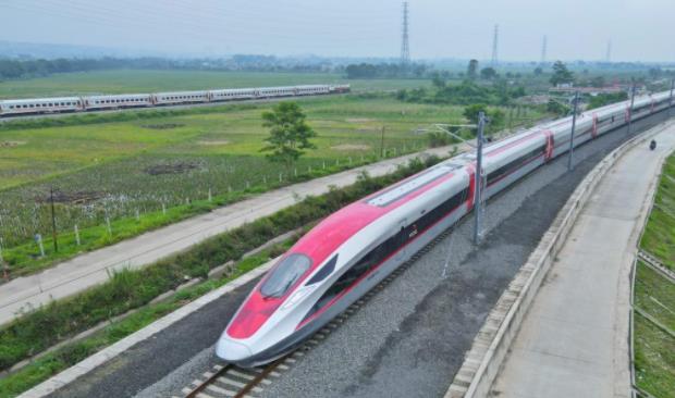 在印度尼西亚西爪哇省万隆市,一列高铁动车组正在雅万高铁试验段进行热滑试验(2022年11月9日摄,无人机照片)。新华社发(李培养摄)
