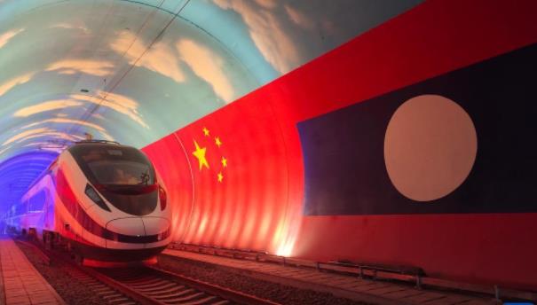 2021年12月3日,中老铁路正式开通运营。这是“澜沧号”动车组通过中老友谊隧道内的两国边界(2021年10月15日摄)。新华社发(曹安宁摄)