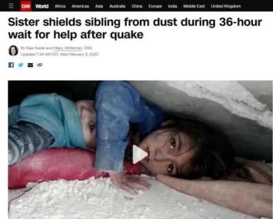 叙利亚西北部伊德利卜省一个村落遭遇强震后,一对年幼姐弟在废墟中受困超过36小时后终于获救。搜救人员发现被夹在巨大水泥板中间的姐弟时,姐姐正举起小小的手臂,保护着弟弟头部。