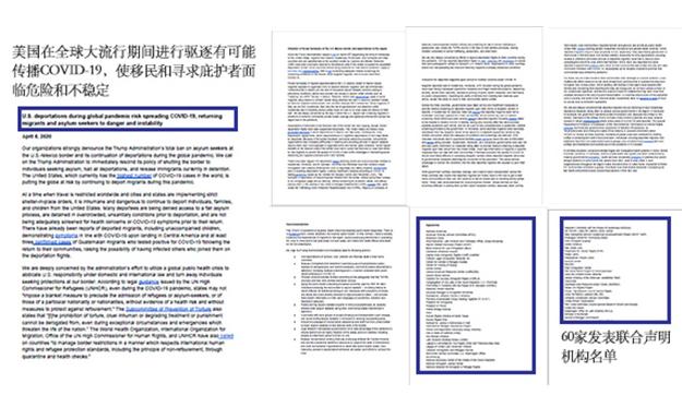 图为全球60家机构发表的谴责美国在疫情期间驱逐非法移民的联合声明