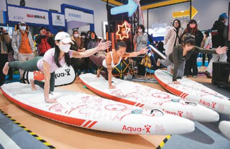 日前,2023亚洲运动用品与时尚展在国家会议中心举行。国内外220家展商、360余个品牌集体亮相,展览面积达3万平方米,涵盖滑雪、骑行等丰富的户外运动项目。图为参观者在展会上体验桨板瑜伽。新华社记者 张晨霖摄