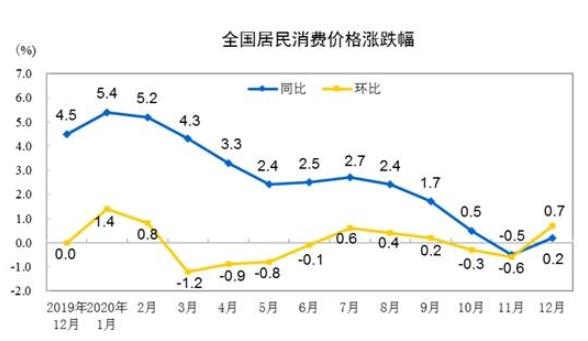12月份,全国居民消费价格环比上涨0.7%。其中,城市上涨0.7%,农村上涨0.9%;食品价格上涨2.8%,非食品价格上涨0.1%;消费品价格上涨1.2%,服务价格持平。