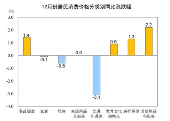 12月份,食品烟酒类价格同比上涨1.4%,影响CPI(居民消费价格指数)上涨约0.44个百分点。食品中,鲜菜价格上涨6.5%,影响CPI上涨约0.17个百分点;鲜果价格上涨6.5%,影响CPI上涨约0.11个百分点;水产品价格上涨1.7%,影响CPI上涨约0.03个百分点;畜肉类价格上涨0.6%,影响CPI上涨约0.04个百分点,其中猪肉价格下降1.3%,影响CPI下降约0.06个百分点;蛋类价格下降10.8%,影响CPI下降约0.07个百分点。