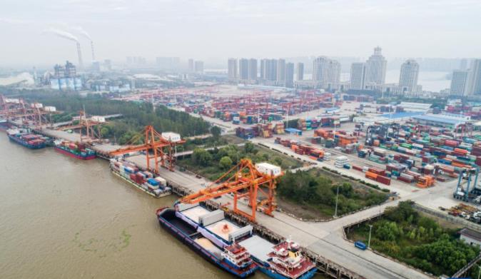 这是10月19日拍摄的武汉阳逻港一期码头(无人机照片)。新华社发(伍志尊摄)