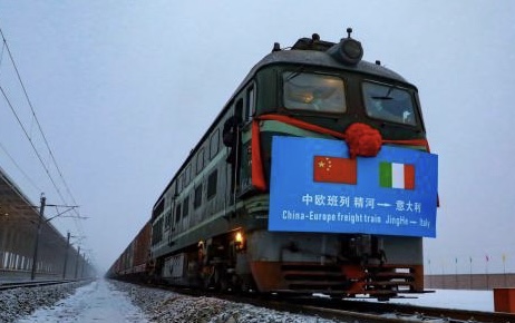 资料图:满载着100个标箱新疆地产番茄酱的中欧班列从新疆精河国际公铁联运综合物流园鸣笛启程。 安晓龙 摄