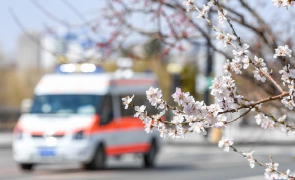 4月14日,一辆救护车在吉林市松江东路上驶过,路边桃花已经盛开。新华社记者 张楠 摄