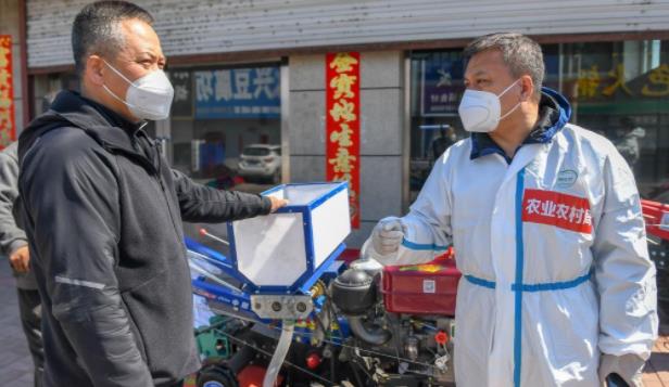 4月13日,在吉林市桦皮厂镇,吉林市农业机械化技术推广中心主任张守国(右)指导农民选购农机。吉林市农业农村局开辟备春耕运输“绿色通道”,将农资农机按时按需送到农民所在村屯。新华社记者 张楠 摄