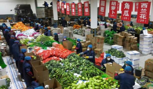 吉林省梅河口市工作人员进行“蔬菜包”菜品分拣(4月7日摄,无人机照片)。新华社发