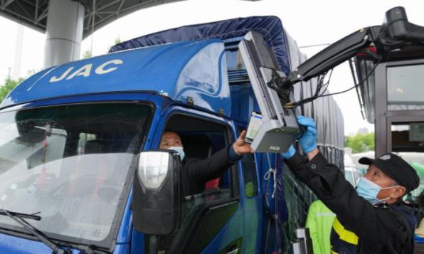4月13日,在合肥百大周谷堆大兴农产品物流园,司机在智能化门禁系统上扫码进入。该园建立集测温、核验安康码、数据收集等功能的智能化门禁系统,进场驾乘人员不用下车即可快速核验,实现防疫测温智能化、人车追溯数据化。新华社记者 杜宇 摄