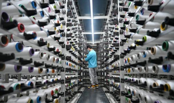 4月12日,在福建泉州石狮市的一家纺织企业,工人在工厂里忙碌。新华社发(周义摄)