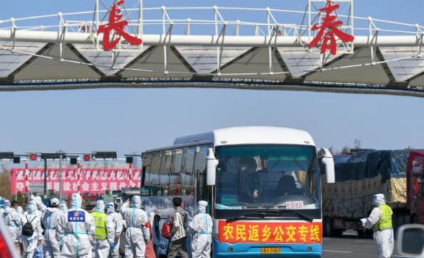 在吉林长春高速公路东出口,返乡农民登上返乡公交专线(4月12日摄)。新华社发