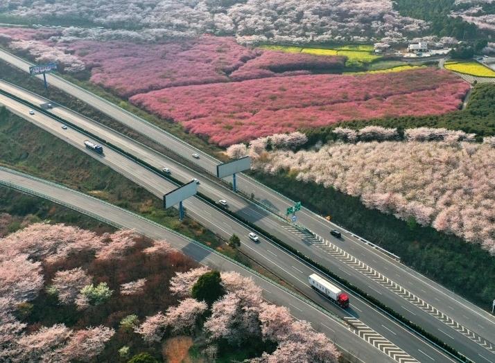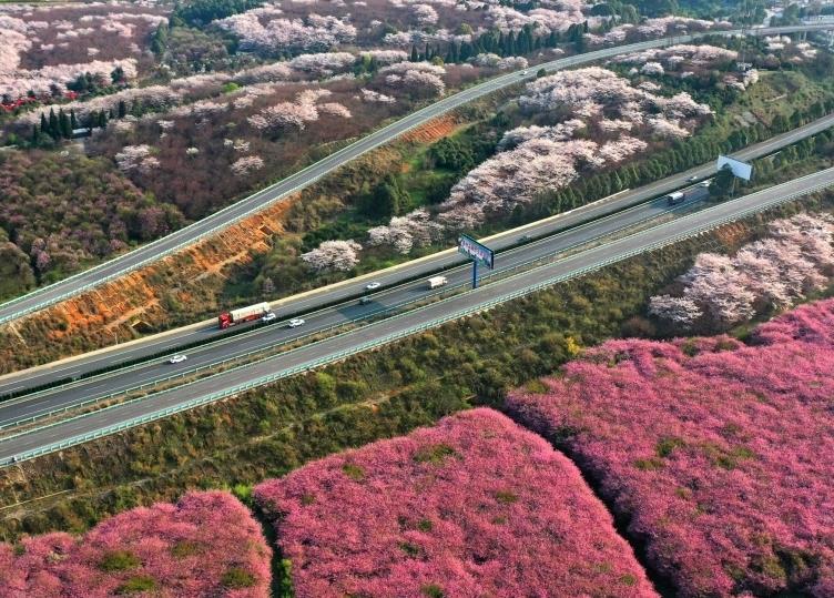 3月23日,贵州清镇,右二村和大冲村近万亩樱花竞相开放,漫山遍野形成一片花海,沪昆高速从花海中穿过,场景壮美。
