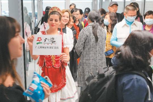在匈牙利布达佩斯机场,一名女士身穿匈牙利民族服装欢迎中国游客到来。弗尔季·奥蒂洛摄(新华社发)