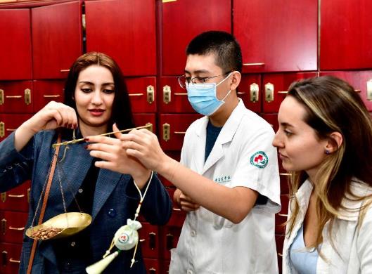 10月18日,在青岛西海岸新区中医医院,山东科技大学国际交流学院伊朗籍留学生哈畀蒂(左一)在体验中药称重。