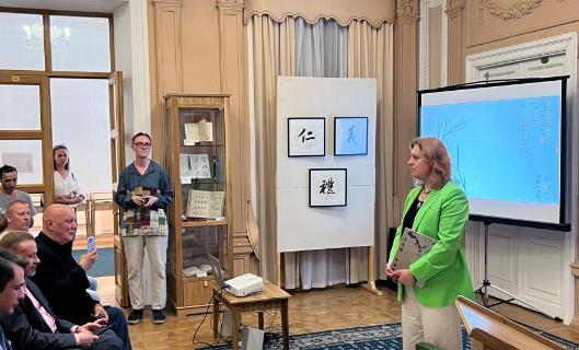 当地时间5月28日,为庆祝中俄建交75周年暨中俄文化年,俄罗斯国立图书馆东方文学中心、俄中友好协会、俄罗斯科学院中国与现代亚洲研究所在莫斯科联合举办中国文化日活动。同时举办主题展开幕式,展出俄罗斯中国画画家、汉学家安娜·冬岑科(中文名“冬青国”)近年来创作的画作,中国书法家的书法作品,以及俄罗斯国立图书馆东方文学中心馆藏的有关中国书法、绘画的中文古籍等。图为安娜·冬岑科在开幕式上致辞。