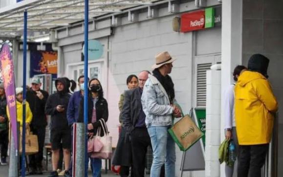 资料图:当地时间8月17日,新西兰奥克兰,民众排队进入超市采购生活用品。