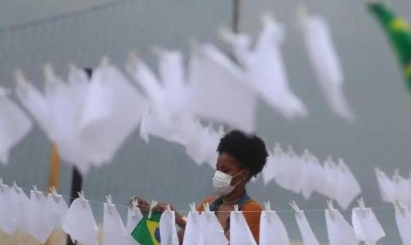 资料图:当地时间10月8日,巴西里约一民间组织为纪念死于新冠肺炎的60万巴西人,在科帕卡帕纳海竖起桅杆,并在上面悬挂600条白色手帕,活动组织者称这600条白手帕除了纪念病亡的60万同胞。