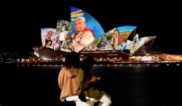 资料图:当地时间2021年10月18日,澳大利亚悉尼歌剧院举行投影秀,致敬抗疫医护人员和已经接种了新冠疫苗的民众。