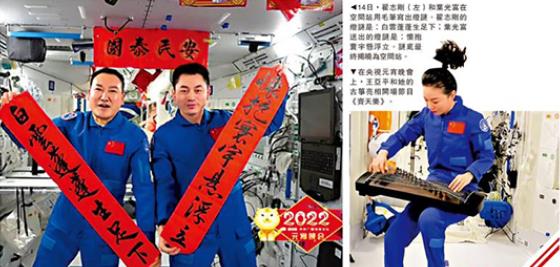左图:14日,翟志刚(左)和叶光富在空间站用毛笔写出灯谜。翟志刚的灯谜是:白云蓬蓬生足下;叶光富送出的灯谜是:怀抱寰宇悬浮立。谜底最终揭晓为空间站。右图:在央视元宵晚会上,王亚平和她的古筝亮相开场节目《齐天乐》。