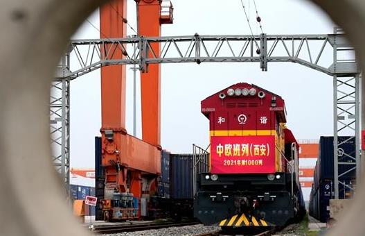 满载自行车、玩具、洗碗机等50车货品的X9041次中欧班列(西安),13日从中国铁路西安局集团有限公司西安国际港站驶出,开往哈萨克斯坦,这是2021年陕西开行的第1000列中欧班列。