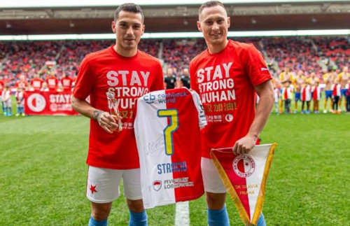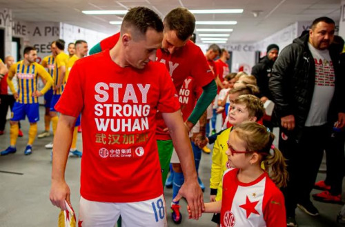 开赛前,赛场四周的广告屏打出“武汉加油”的口号,主场队员身着印有“武汉加油”字样的特别球衣入场,并拉出横幅向中国人民表达慰问和支持,全场球迷热烈回应。赛后,斯拉维亚俱乐部还将举行线上“武汉加油”主题球衣拍卖,为奋战在抗疫一线的医务工作者募集医疗物资。