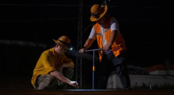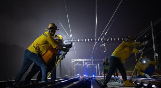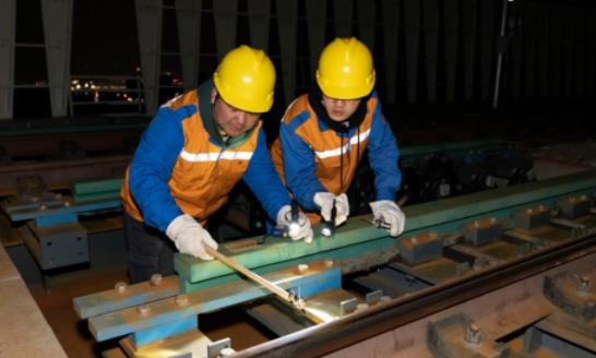 1月19日凌晨,昆明铁路局普洱基础设施段工务维修技术中心桥隧工施鹏彬(左)和同事孙顺良利用“天窗时间”,在中老铁路元江双线特大桥检修铁轨。新华社记者 陈欣波 摄