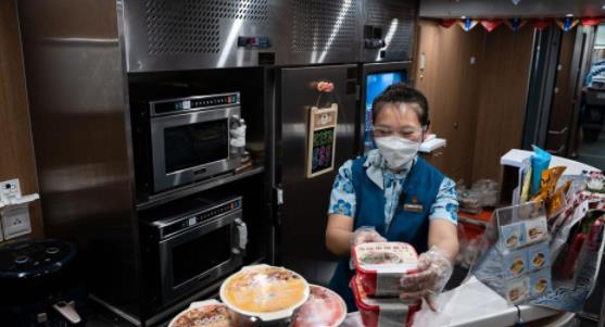 6月2日,中国铁路昆明局集团有限公司昆明客运段乘务员在整理餐吧。新华社记者 王冠森 摄