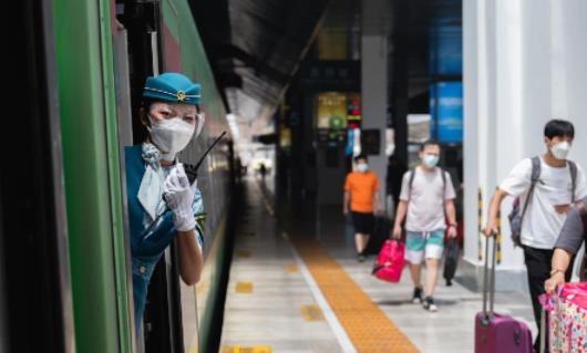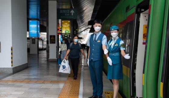 6月2日,中国铁路昆明局集团有限公司昆明客运段乘务员在昆明站迎接乘客。新华社记者 王冠森 摄