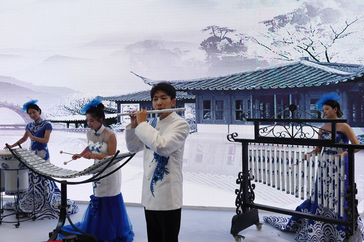 10月18日,演员在瓷博会现场演奏陶瓷乐器。新华社记者 马宁 摄