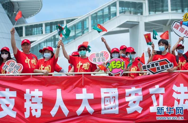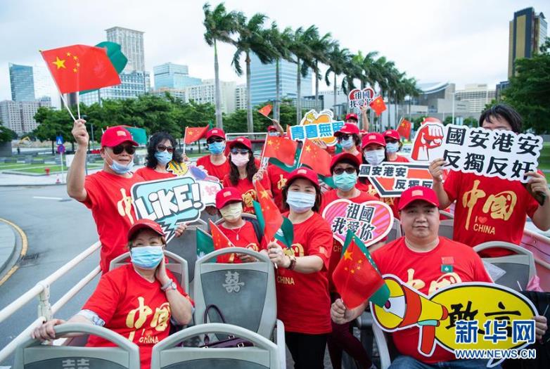 6月5日,澳门爱国爱澳青年社团培青社成员参加支持涉港国安立法的巴士巡游活动。 新华社记者 张金加 摄