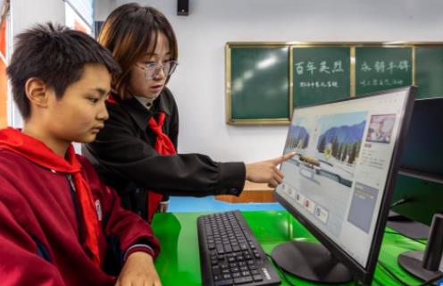 4月1日,在贵州省黔西市惠风学校,老师指导学生通过网络祭奠烈士。清明将至,人们来到烈士陵园,或通过英烈网,祭奠和缅怀先烈。新华社发(范晖摄)