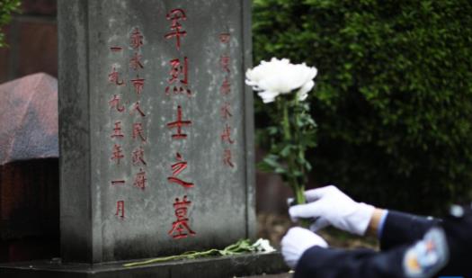 4月1日,在贵州省赤水市红军烈士陵园,民警向红军烈士墓敬献鲜花。清明将至,人们来到烈士陵园,或通过英烈网,祭奠和缅怀先烈。新华社发(王长育摄)