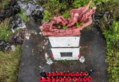 4月1日,学生在贵州省黔西市大关镇红军抢渡鸭池河天险纪念碑前默哀(无人机照片)。清明将至,人们来到烈士陵园,或通过英烈网,祭奠和缅怀先烈。新华社发(范晖摄)