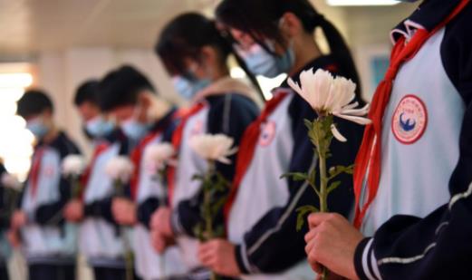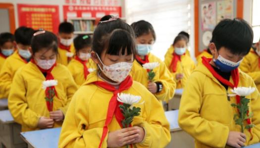 4月1日,在山东省聊城市茌平区菜屯镇中心小学,学生手持鲜花参加“清明祭英烈”线上活动。清明将至,人们来到烈士陵园,或通过英烈网,祭奠和缅怀先烈。新华社发(赵玉国摄)